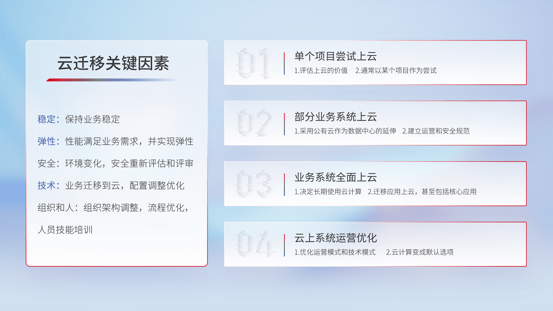 结合实际业务,,,,从规划设计、、、云平台选型、、云原生改造、、、、数据迁移、、、、集成交付,,,迁移全过程为客户识别最佳上云路径,,,,做好风险识别管理,,,设计网络架构、、、身份权限、、、、安全审计合规、、、操作审计、、、、日志审计、、监控告警策略、、、多站点容灾设计等,,,,对云上基础设施进行整体规划,,,提升IT治理水平,,以满足弹性、、、、高可用、、、高性能的需求。。