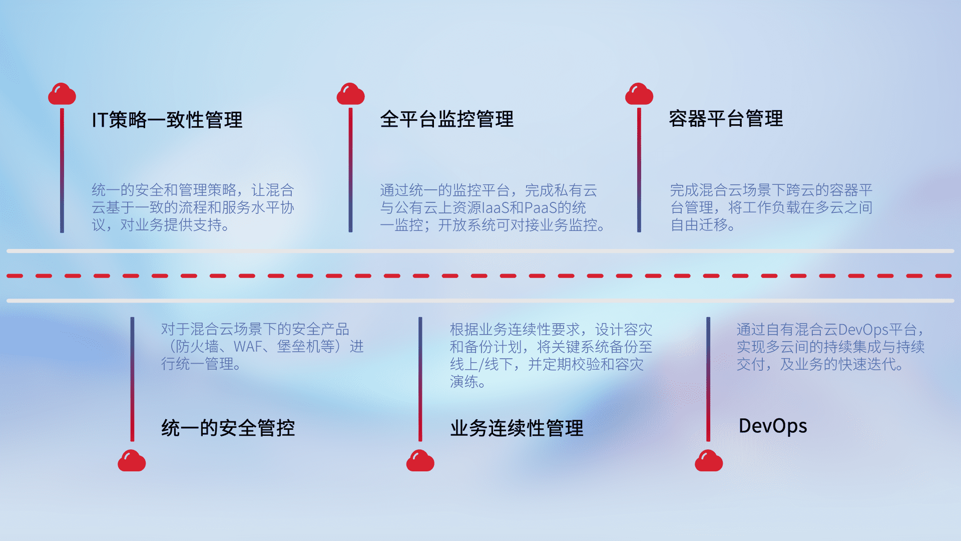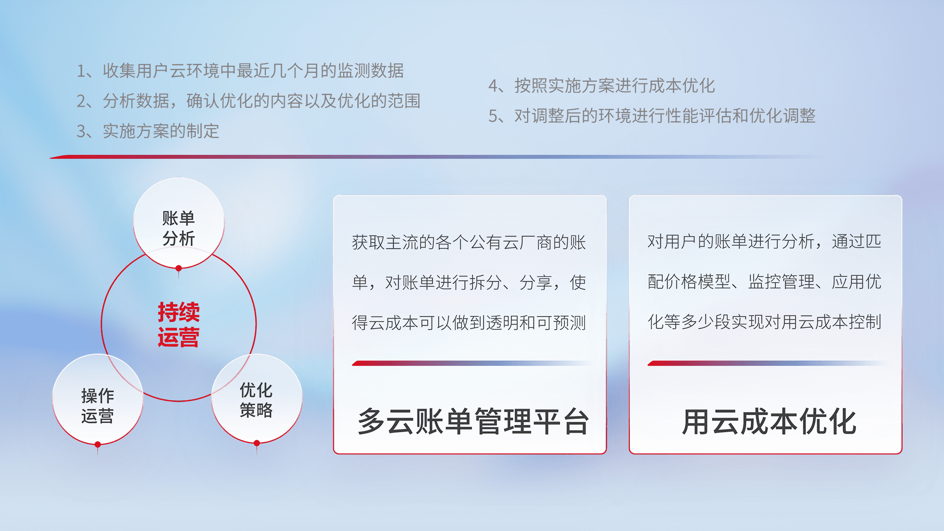 通过多云纳管,,,,以统一的资源数据模型把客户的云资源进行抽象和封装,,,,进而实现对多云资源的统一操作,,保障云资源管理的可靠性、、、、稳定性与可用性。。。量身定制化运维内容,,,,配置、、、、开发运维、、补丁管理、、、、备份、、监控、、、、认证和访问管理、、、审计和日常巡检等,,,,保障在用云过程中的可靠度,,,稳定度以及高可用率。。
